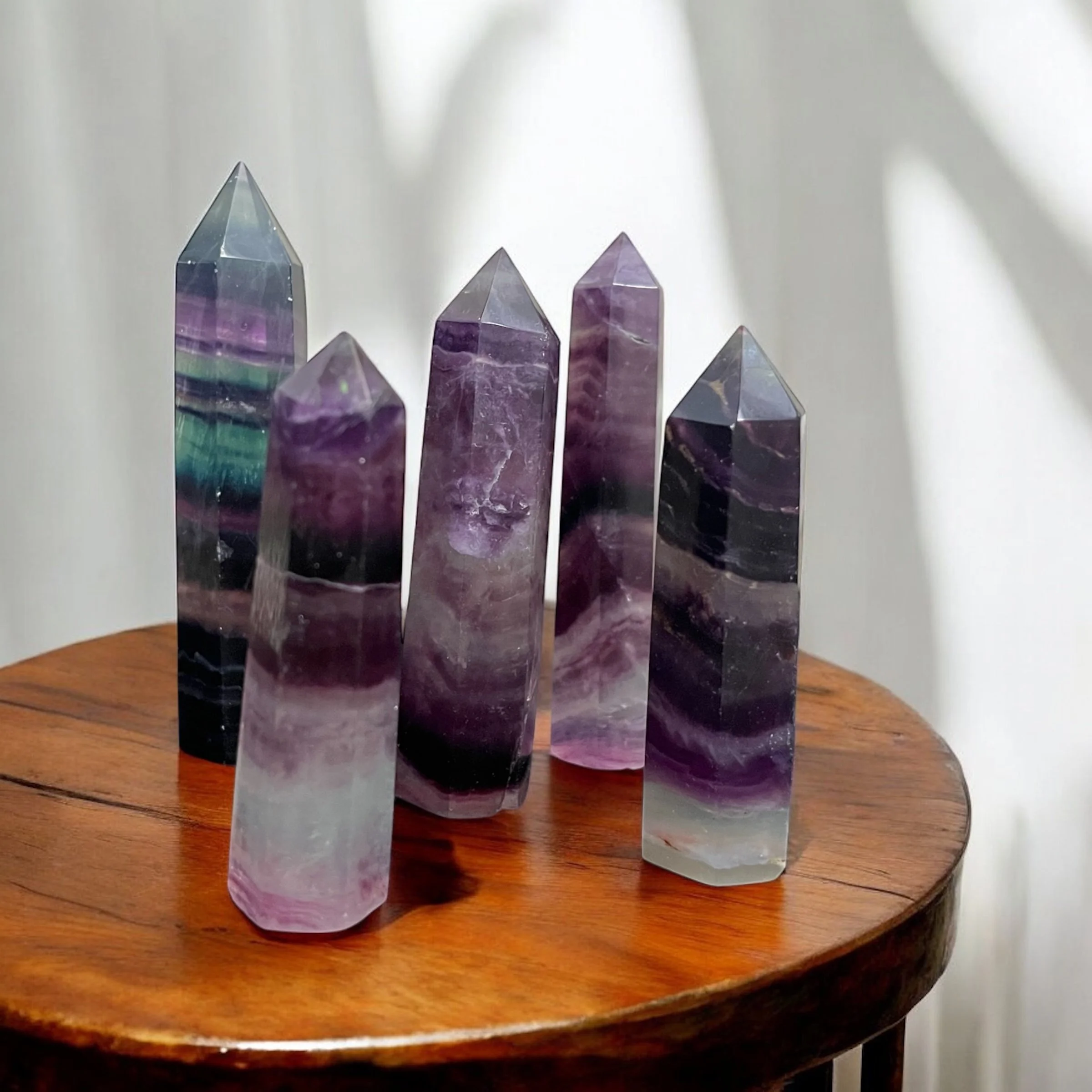 Fluorite is a vibrant and captivating crystal known for its stunning range of colors, which can include purple, green, yellow, blue and even clear. This gemstone is often referred to as the "genius stone" because it's believed to enhance mental clarity and concentration, making it a favorite among students and professionals alike.